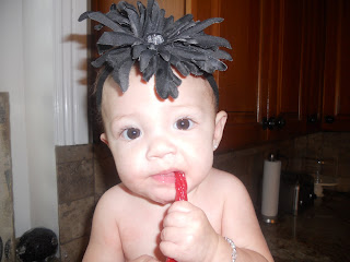 - This little sweetheart is so cute. Abbie went to Smedley's and kidnapped her for a few hours and stopped by to play. We gave her a cracker (I don't think she eats those yet) and she kind of chocked! We decided she was like her Aunt Angie and would love sugar so we gave her a licorice and she loved it!